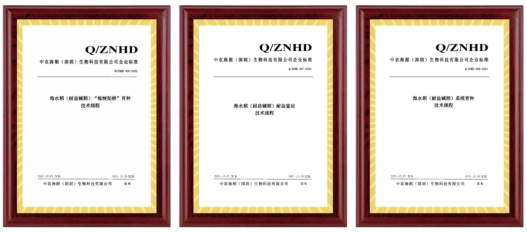 2021年12月23日,由中農海稻(深圳)生物科技有限公司起草的海水稻(耐鹽堿稻)“秈粳架橋”育種技術規程(Q/ZNHD 005-2021)、海水稻(耐鹽堿稻)育種技術規程(Q/ZNHD 006-2021)、海水稻(耐鹽堿稻)耐鹽鑒定技術規程(Q/ZNHD 007-2021)三個企業標準正式發布。