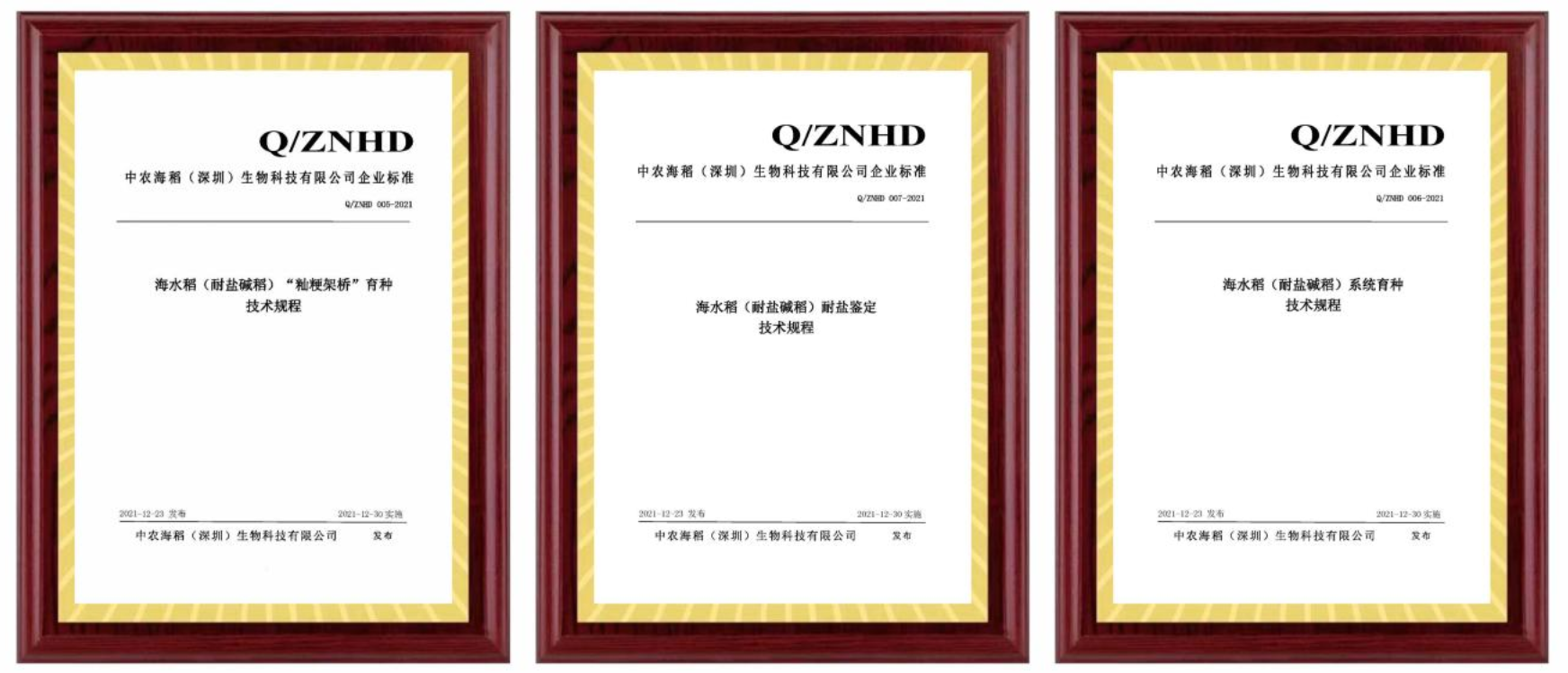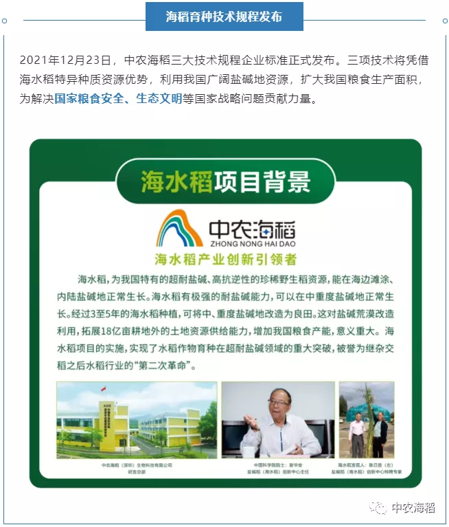 2021年12月23日,由中農海稻(深圳)生物科技有限公司起草的海水稻(耐鹽堿稻)“秈粳架橋”育種技術規程(Q/ZNHD 005-2021)、海水稻(耐鹽堿稻)育種技術規程(Q/ZNHD 006-2021)、海水稻(耐鹽堿稻)耐鹽鑒定技術規程(Q/ZNHD 007-2021)三個企業標準正式發布。